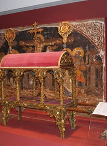 Επιστήθιος Σταυρός - λειψανοθήκη (Ίσως 16ος αιώνας). Χρυσός, κοσμημένος μέ έκτυπες παραστάσεις. Ρουμπίνια, τουρκουάζ μαργαριτάρια καί πολύτιμες πέτρες. Δώρο τής Αίκατερίνης τής Μεγάλης, Αυτοκράτειρας τής Ρωσίας (18ος αιώνας).