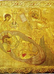 Επιγονάτιο με παράσταση "του Αναπεσοντος" (15ος αιώνας, είναι το αρχαιότερο). Παριστάνεται ο Ιησούς ώς Βρέφος ξαπλωμένος σέ λίκνο καί ονειρεύεται τόν μελλοντικό Σταυρό καί τά Σύμβολα του Πάθους πού του δείχνει ο Αρχάγγελος Γαβριήλ. Ή Παναγία δεξιά ανεμίζει προστατευτικά μέ ριπίδιο τό κοιμώμενο Βρέφος. Ή παράσταση συμβολίζει τήν ενσάρκωση του Λόγου καί τή λύτρωση του κόσμου.