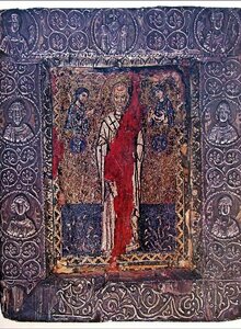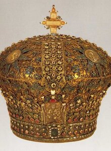 Μίτρα ή Κορώνα. Κατά τήν παράδοση άνηκε στόν αυτοκράτορα Αλέξιο Α΄τόν Κομνηνό. Βυσσινή βελούδο μέ πλούσιο χειροποίητο χρυσοκέντημα καί μαργαριτάρια, μέ παραστάσεις από τήν εις Αδου Κάθοδο, τήν ψηλάφηση του Θωμά κ.α.
