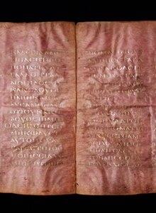 4) Χειρόγραφος Πορφυρούς κώδιξ. απόσπασμα από 33 φύλλα τού κατά Μάρκον Ευαγγελίου (αρχών 6ου αιώνα), περγαμηνή βαμμένη μέ πορφύρα. Γραμμένη μέ κεφαλαία ασημένια γράμματα, ενώ τά Ιερά ονόματα καταγράφονται μέ χρυσά γράμματα.