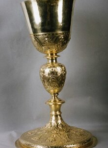 Μνημειακό Άγιο Ποτήριο ( Βενετία 16ος αιώνας) μέ έκτυπη παράσταση τού Χριστού ώς αμπέλου καί τών 12 Μαθητών ώς κλημάτων. Κατά τήν επανάσταση του 1821, ο Πάτμιος Πατριάρχης Αλεξανδρείας, Θεόφιλος Παγκώστας, τέλεσε Θεία Λειτουργία πάνω στή ναυαρχίδα τών Ψαριανών καί κοινώνησε τούς πλοιάρχους καί τούς ναύτες με αυτό, πρίν από τήν νικηφόρο για τούς Έλληνες ναυμαχία του Γυαλιού (κοντά στήν Νίσυρο).