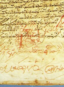 7) Χρυσόβουλλο του Αλεξίου Α΄ τού Κομνηνού, απρίλιος 1088. Ή πρωτότυπη υπογραφή μέ κιννάβαρη (κόκκινη μελάνη που υπέγραφαν μόνο οι αυτοκράτορες ). Τό σπουδαιότερο έγγραφο τής Μονής μέ τό οποίο παραχωρείται - δωρίζεται η Πάτμος καί τά γύρω νησιά (Λειψοί - Αρκιοί - Αγαθονήσι) στόν Όσιο Χριστόδουλο, μέ σκοπό νά ιδρύσει τή Μονή του Αγίου Ιωάννου του Θεολόγου.